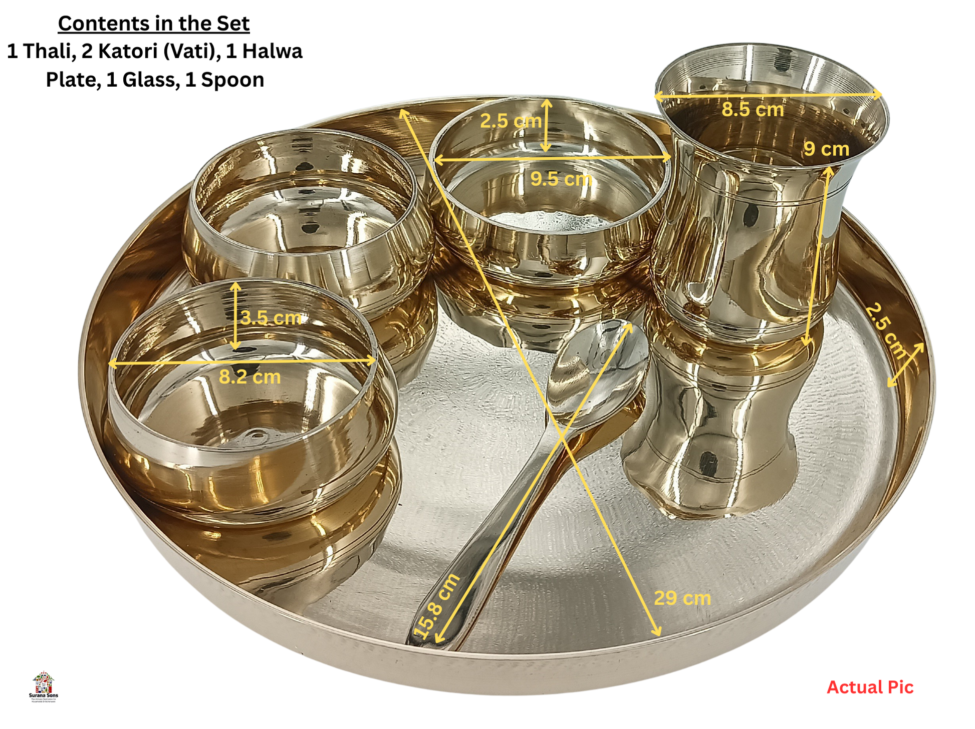 - WHAT YOU GET - Classic Kansa(Bronze) dinner set includes 1 Dish (Thali) dia 29 cm, 2 Katori (bowl) Top dia 8.2 cm, 1 sweet dish, dia 9.5 cm, 1 Spoon – 15.8 cm and 1 Glass(tumbler) 200 ml (Approx.). Total Weight of a Set is 1.7 Kg.