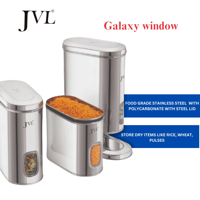 JVL Stainless steel Capsule shape see thru pots/Containers are ideal for storage for daily usable food items. Made of premium quality steel & has mirror polish. The cover is optimum tight to keep items safe & items can be viewed from the front of the pot as there is transparent acrylic sheet fitted in the body, named as "Galaxy Window."