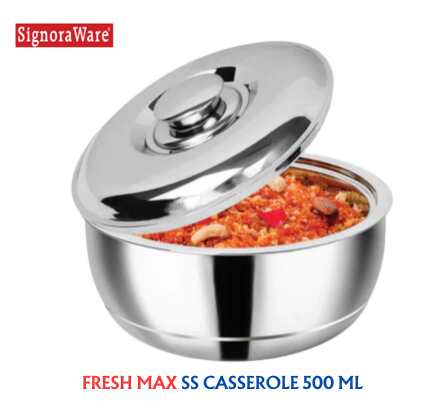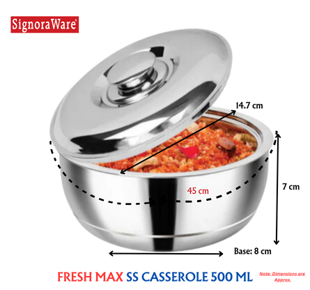 PACKAGE CONTENTS: Enhance the look of your dining table with its exclusive shape and design. Color: Silver, Material: Stainless Steel 1 Fresh Max insulated Casserole (500 ml)