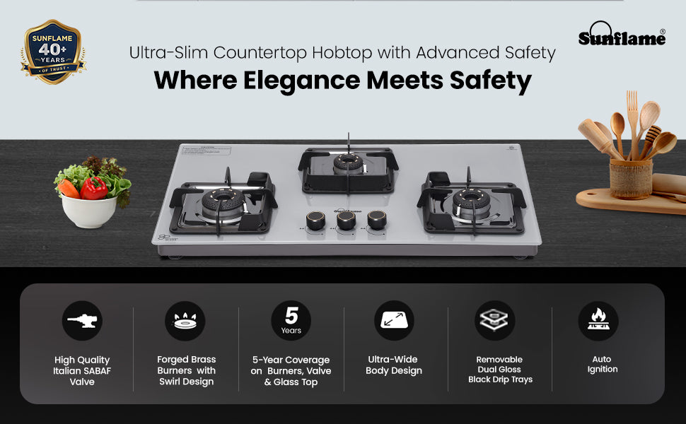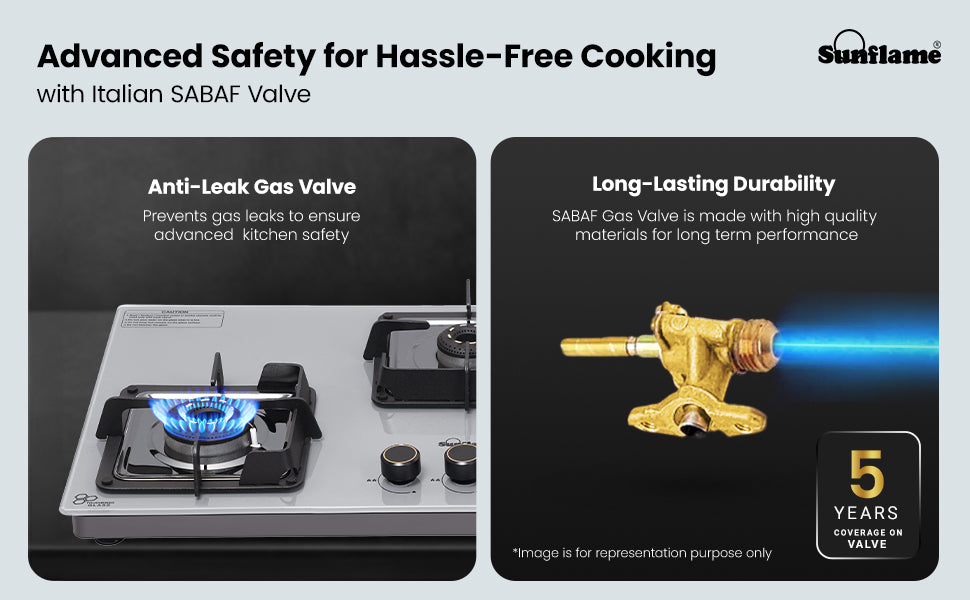 - ADVANCED SAFETY WITH ITALIAN SABAF VALVE: Sunflame 3-burner countertop hob top features best-in-class high-quality Italian SABAF gas valves with advanced safety for a leak-proof and long-lasting performance. The advanced valve system ensures a longer lifespan and a safe cooking environment by preventing potential gas leaks.