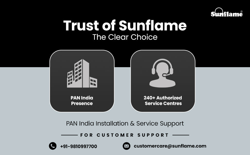 Sunflame Enterprises Pvt Ltd, Mundka Ind. Area (North Side)Vill. Ghevra, Mundka, West Delhi-110041 Customer Care Number: 9810 99 77 00 / 9971 00 55 44 Email: customercare@sunflame.com |