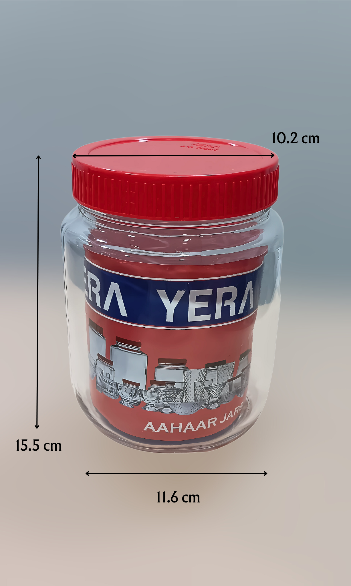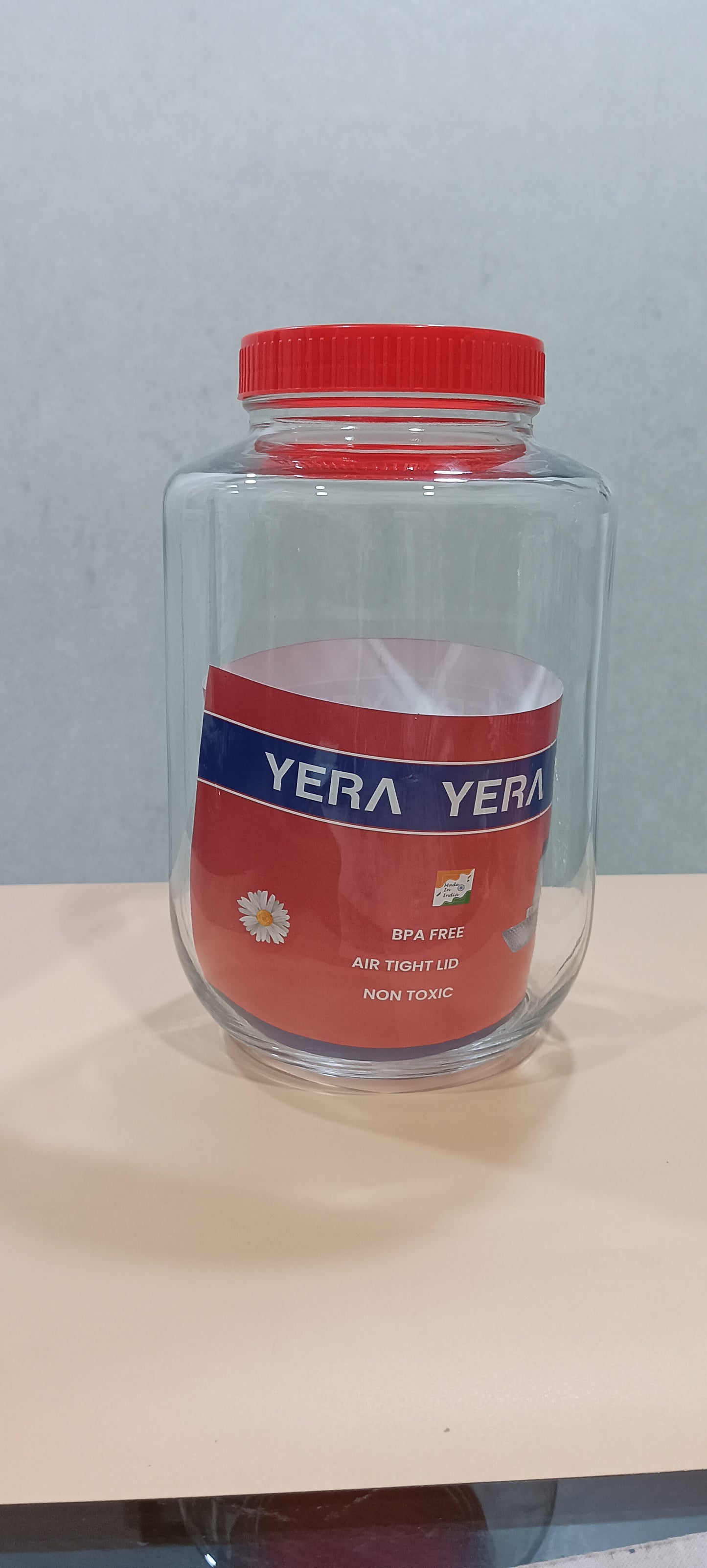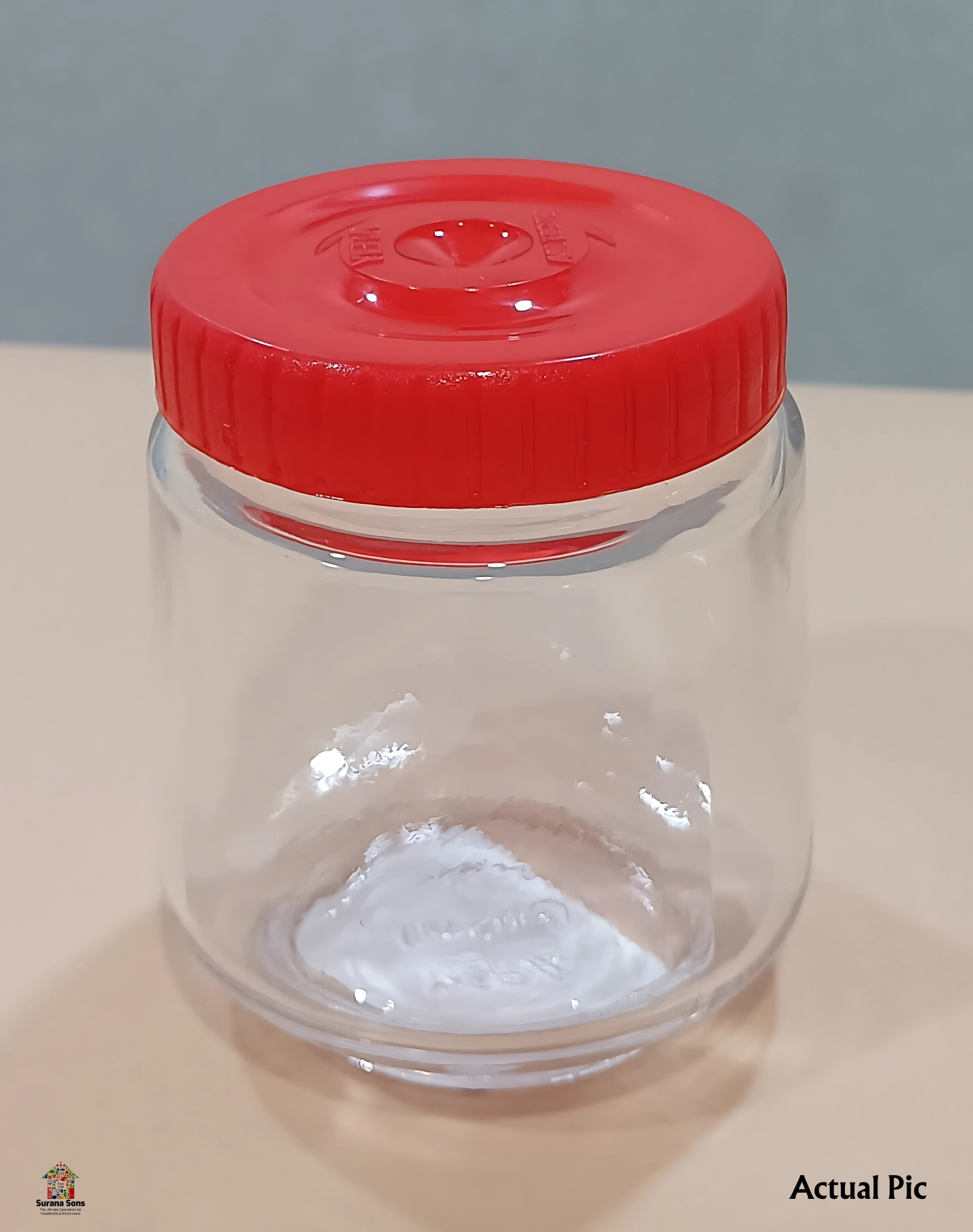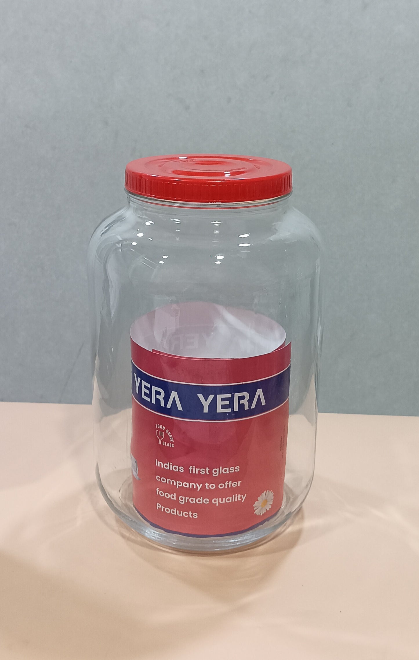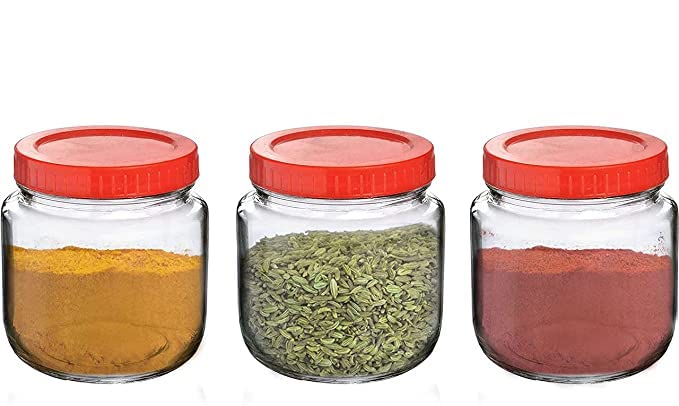 - Brand: Yera Glass - Body Material: Glass - Lid Material: Plastic, Red. Round Glass Jar suitable for modular kitchen, this glass jar is transparent which helps to identify inside contents easily.