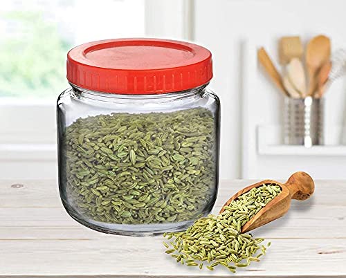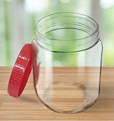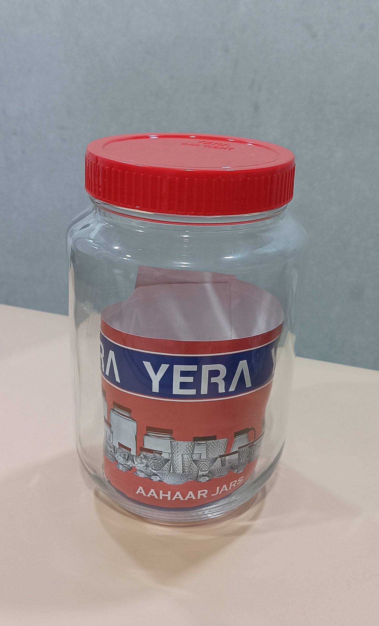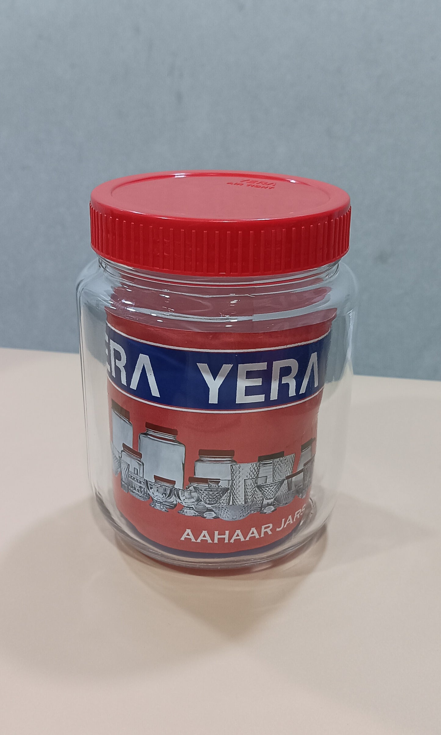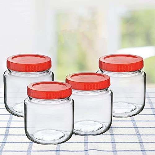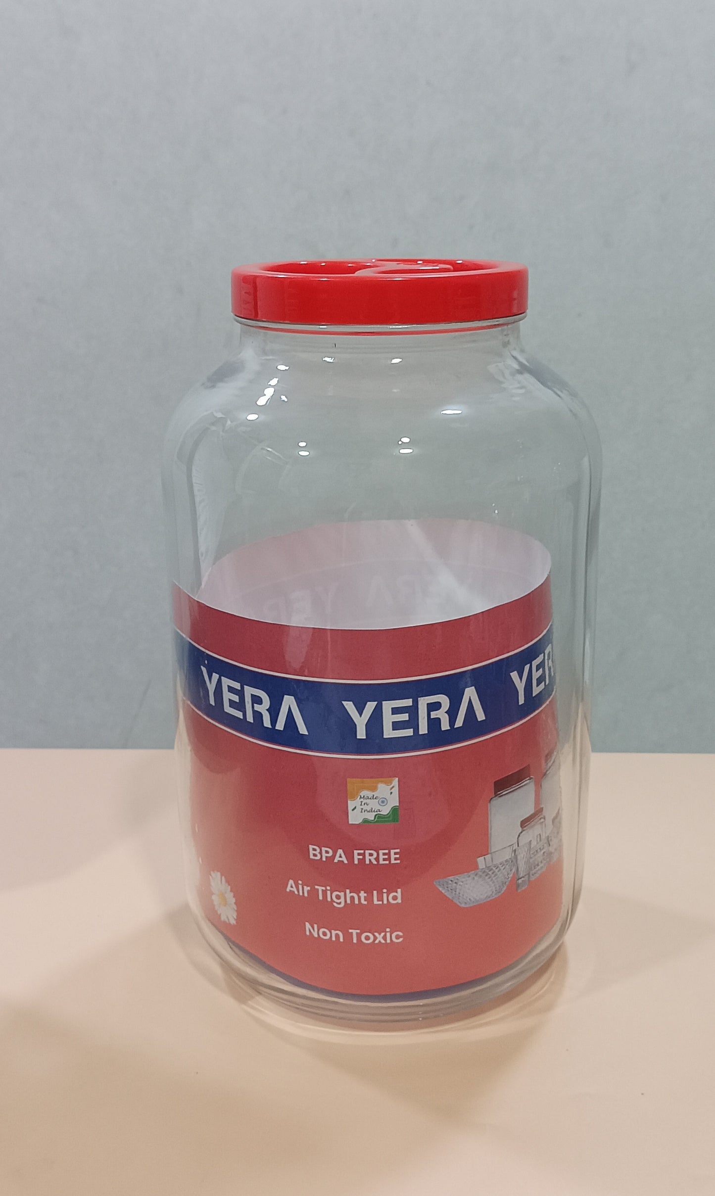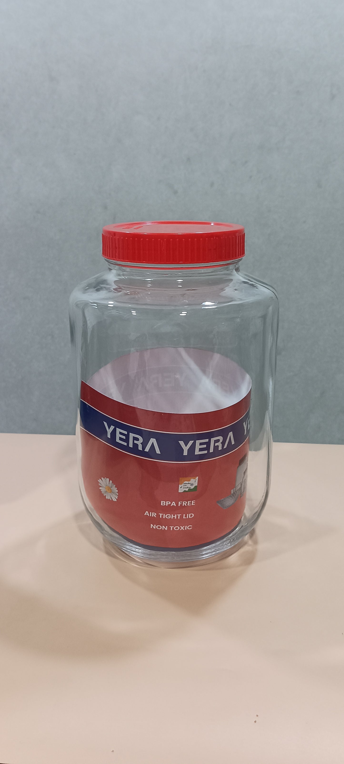 - Brand: Yera Glass - Body Material: Glass - Lid Material: Plastic, Red. Round Glass Jar suitable for modular kitchen, this glass jar is transparent which helps to identify inside contents easily.